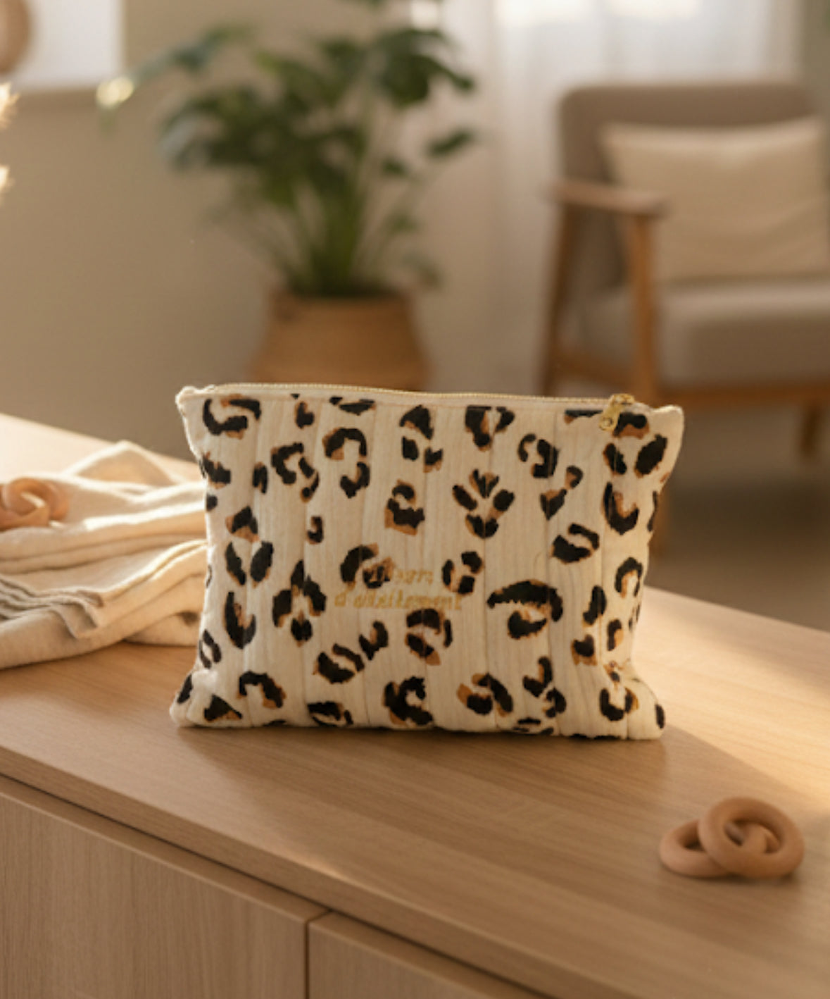 - Une pochette cousue main : réalisée dans mon atelier, réutilisable pour ranger vos trésors au quotidien (accessoires de bébé, petits souvenirs, etc.).