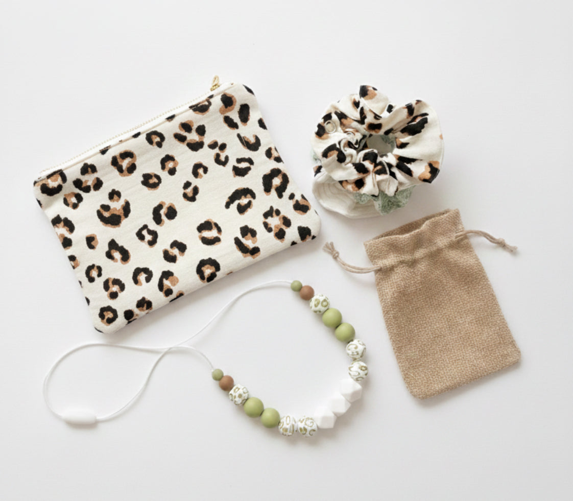 Collier conforme aux normes de sécurité (perles en silicone alimentaire). Chouchous en coton OEKOTEX doux, avec pressions solides et faciles à utiliser. Pochette en tissu cousu main, réutilisable. Fabriqué avec tendresse dans mon atelier, chaque kit est une pièce unique qui accompagne les mamans dans leur belle aventure lactée.